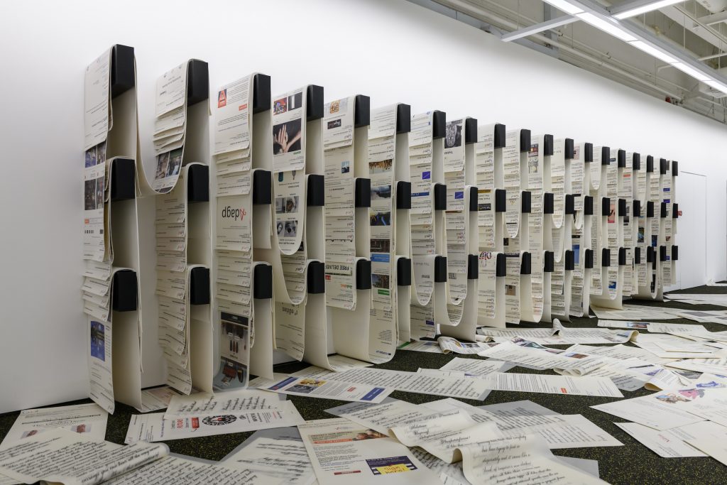 Fig.9. Henrot, C (2016) Office of Unreplied Emails [Printouts, wooden poles] At: https://elephant.art/out-of-office-the-artists-interrogating-the-workplace/ (Accessed 06/10/24)