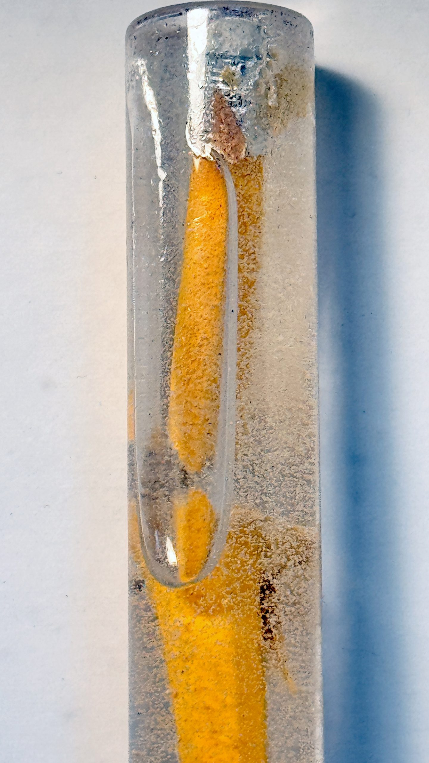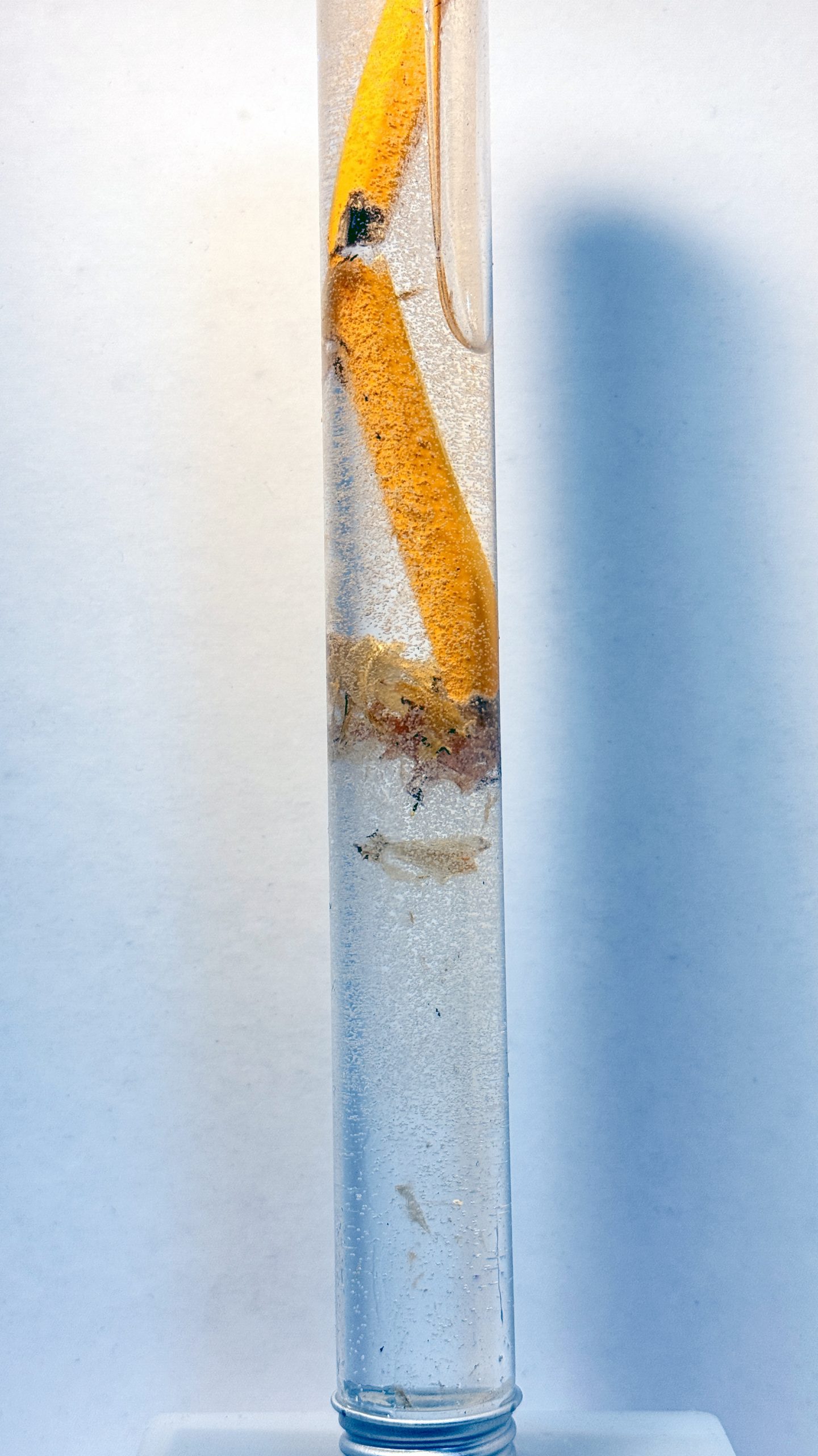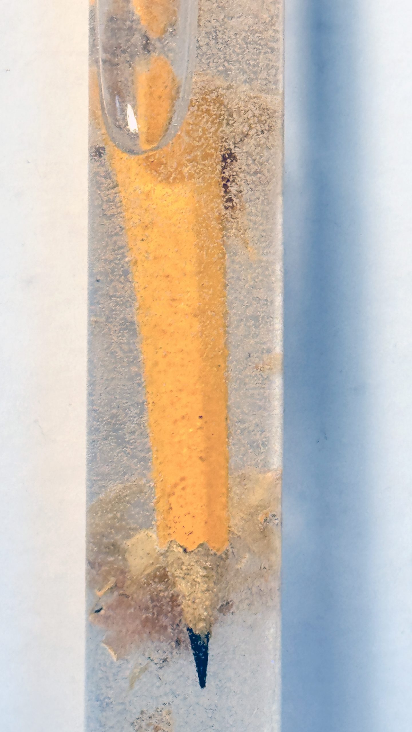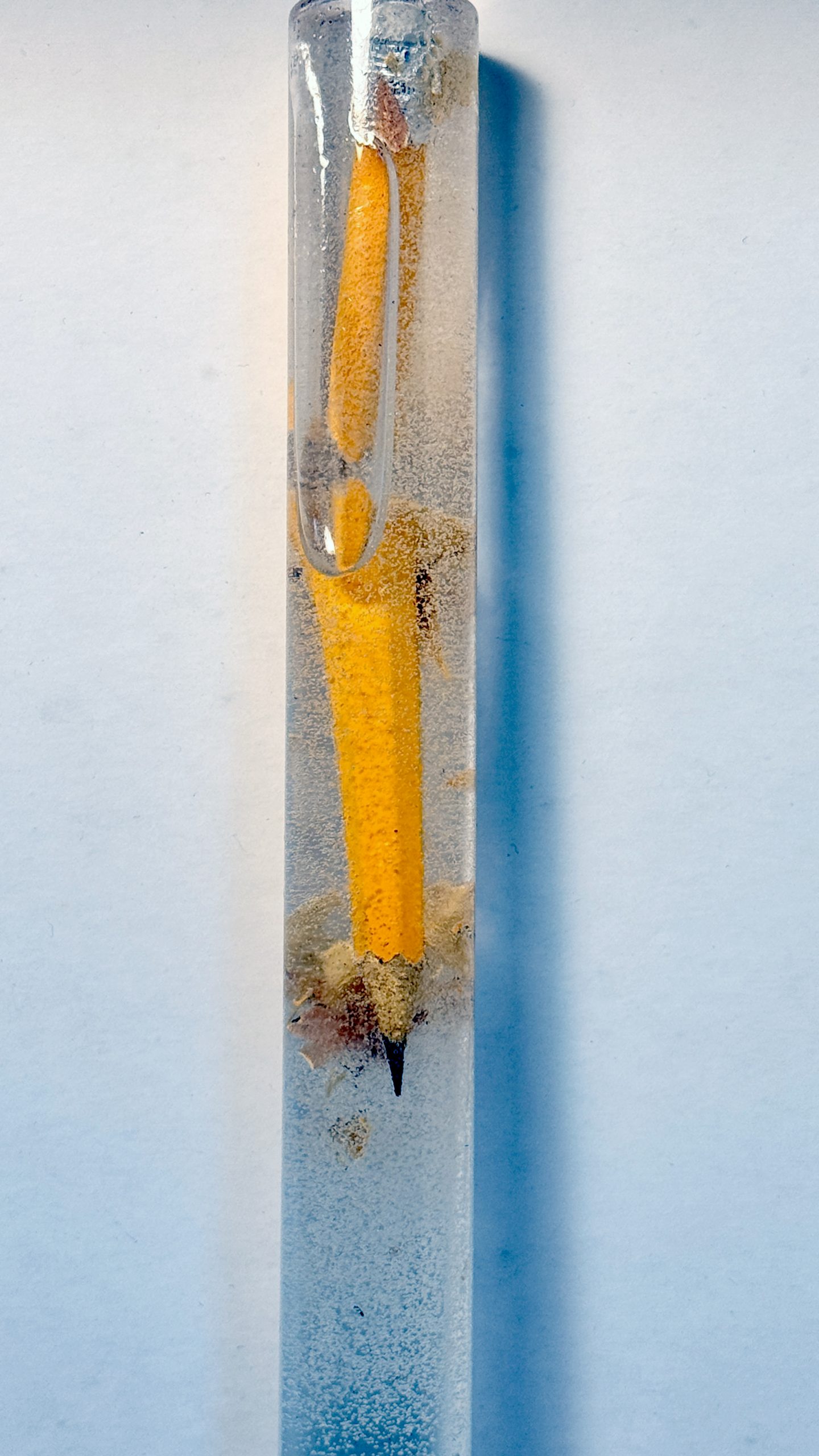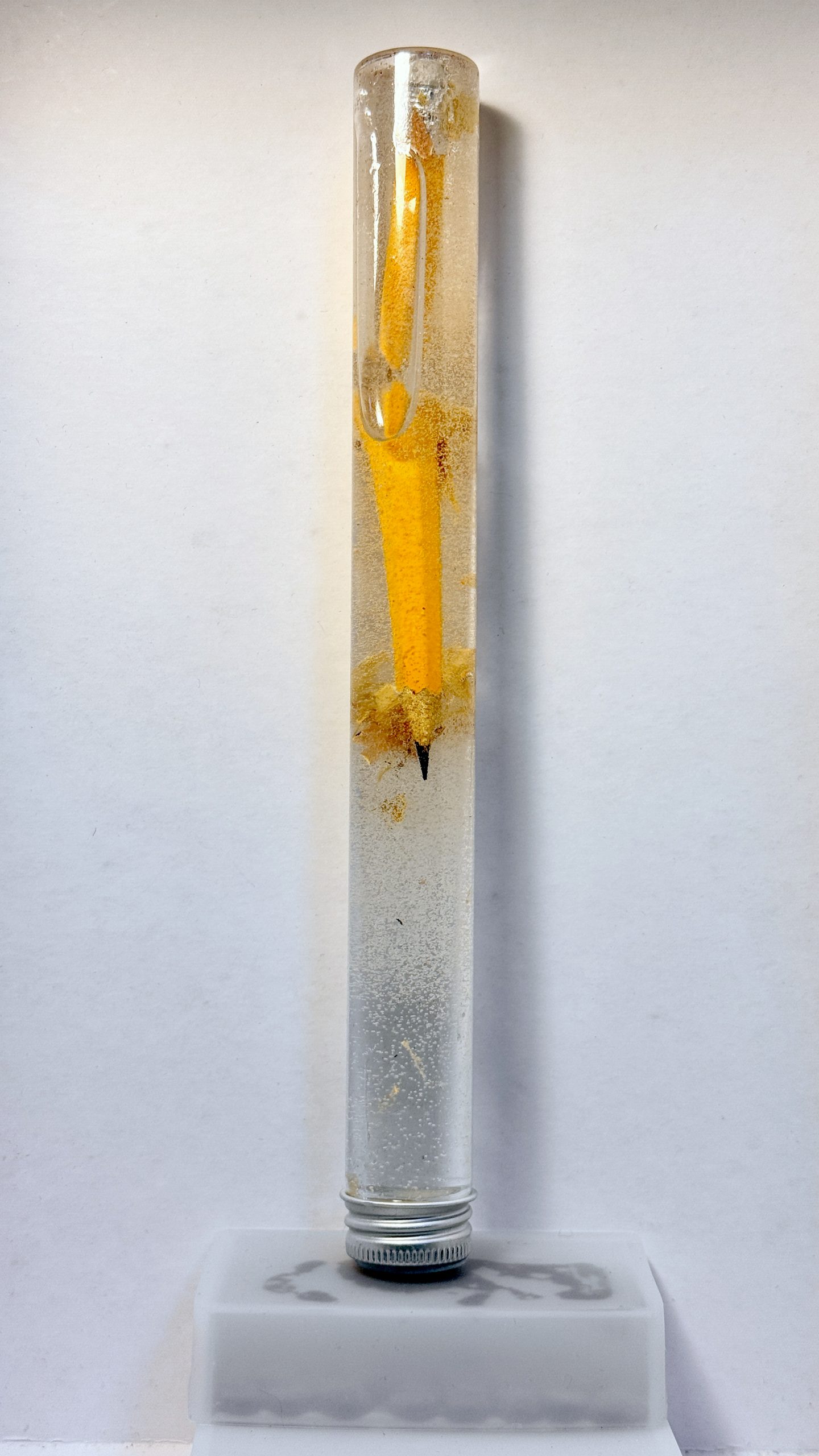 (HB Pencil, pencil shavings, glass tube with metal lid and clear resin: 23.3cm x 3.5cm diameter)