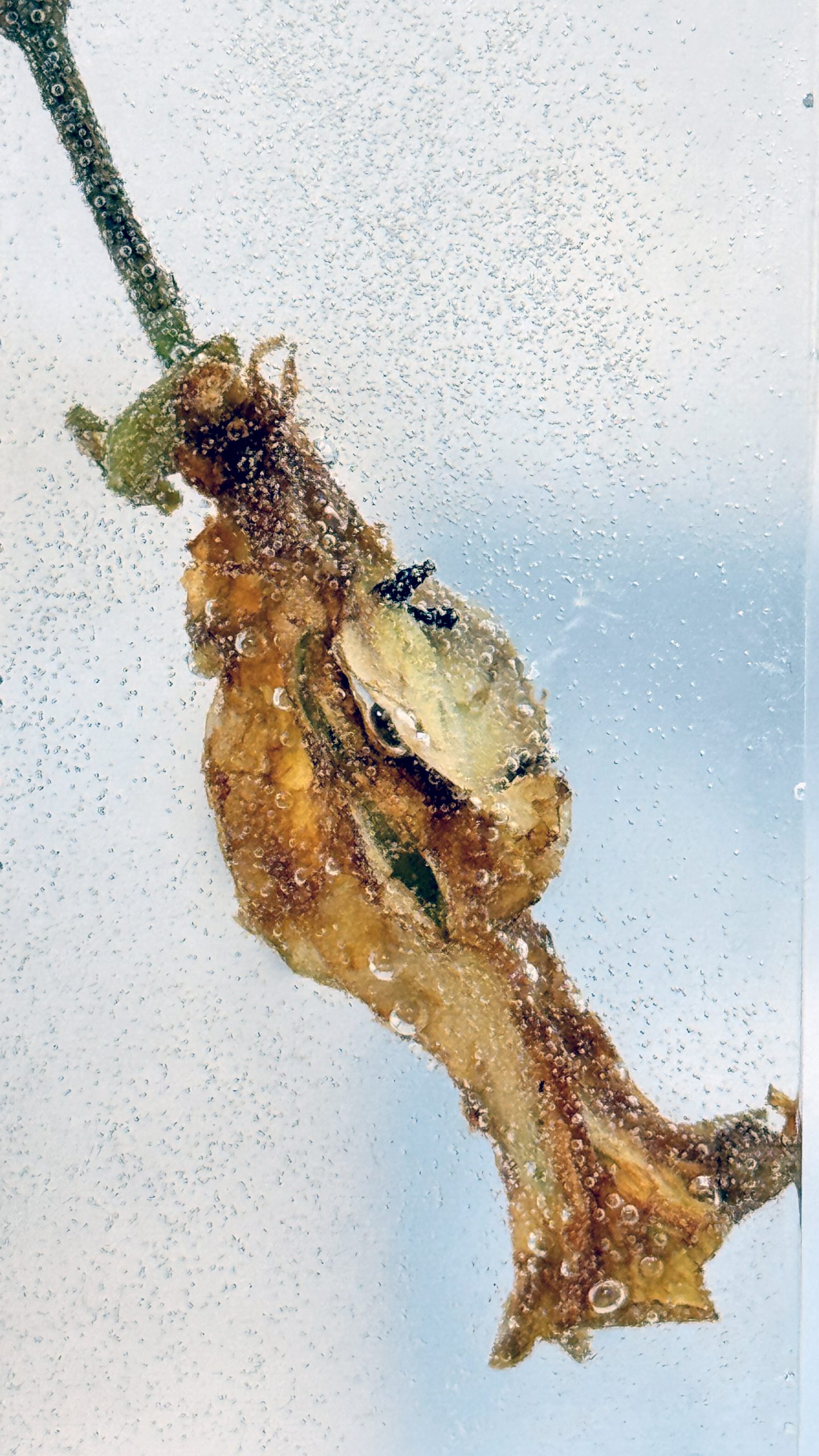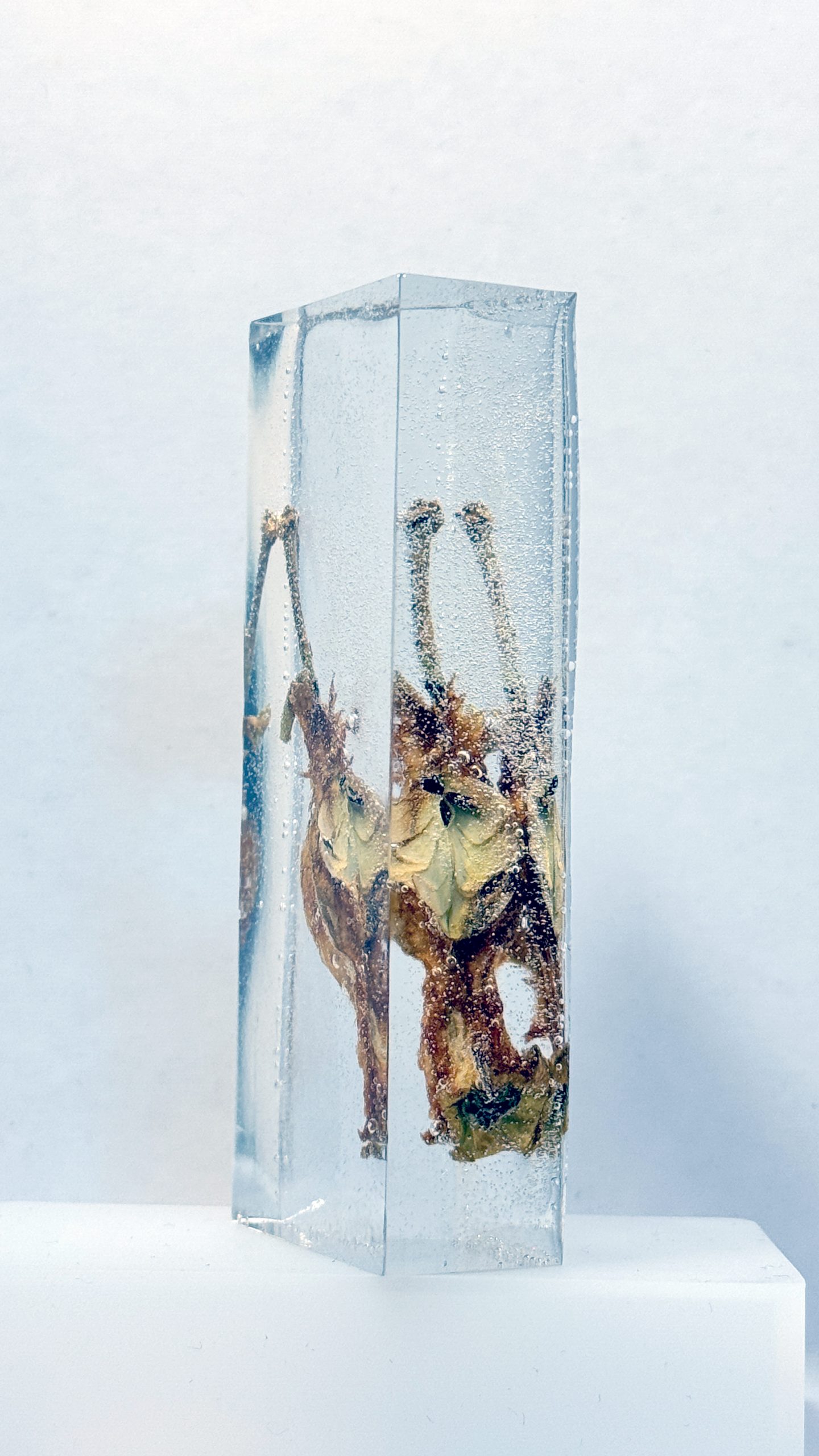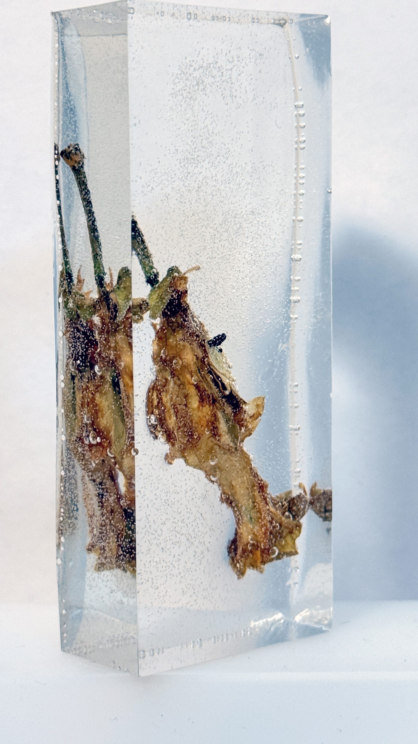 The world is in crisis, in many ways: physical and ideological conflicts, the slow, seemingly inexorable destruction of our natural world, the rape of our natural resources, the extinction of species, our inability to live in harmony with each other and our planet. The mythological and metaphorical garden of Eden is almost no more. This piece is a reflection on this, the symbolism obvious enough, to explain it would patronise the readers intelligence. A memorial to a last vestige of the world, encased in resin, like a prehistoric mosquito in amber.