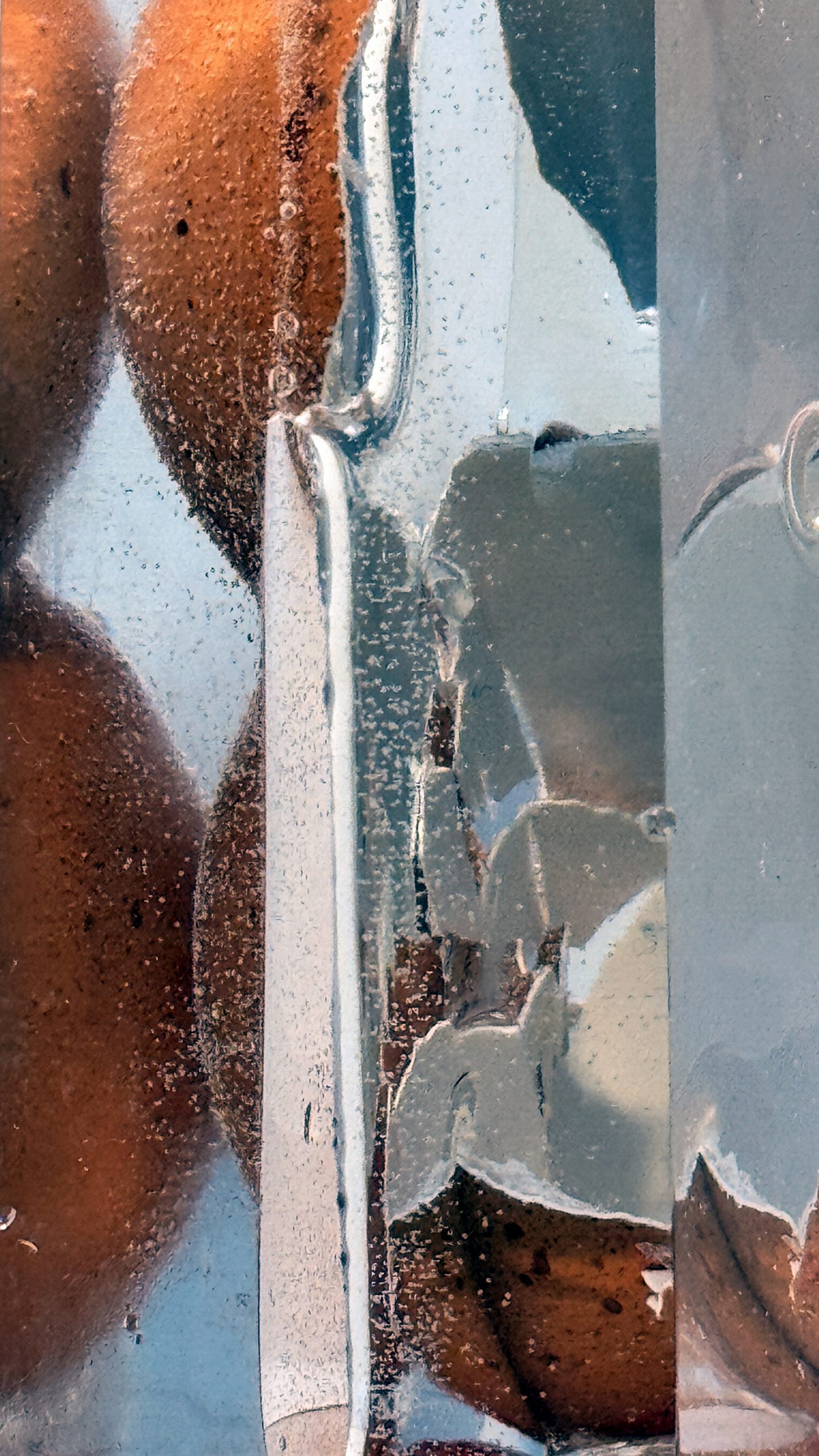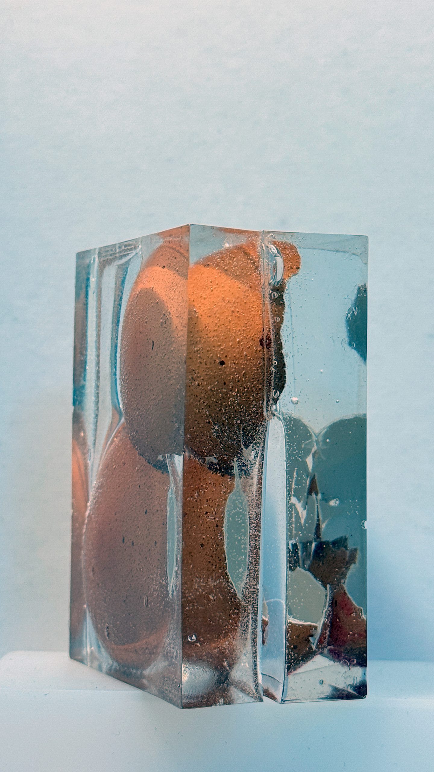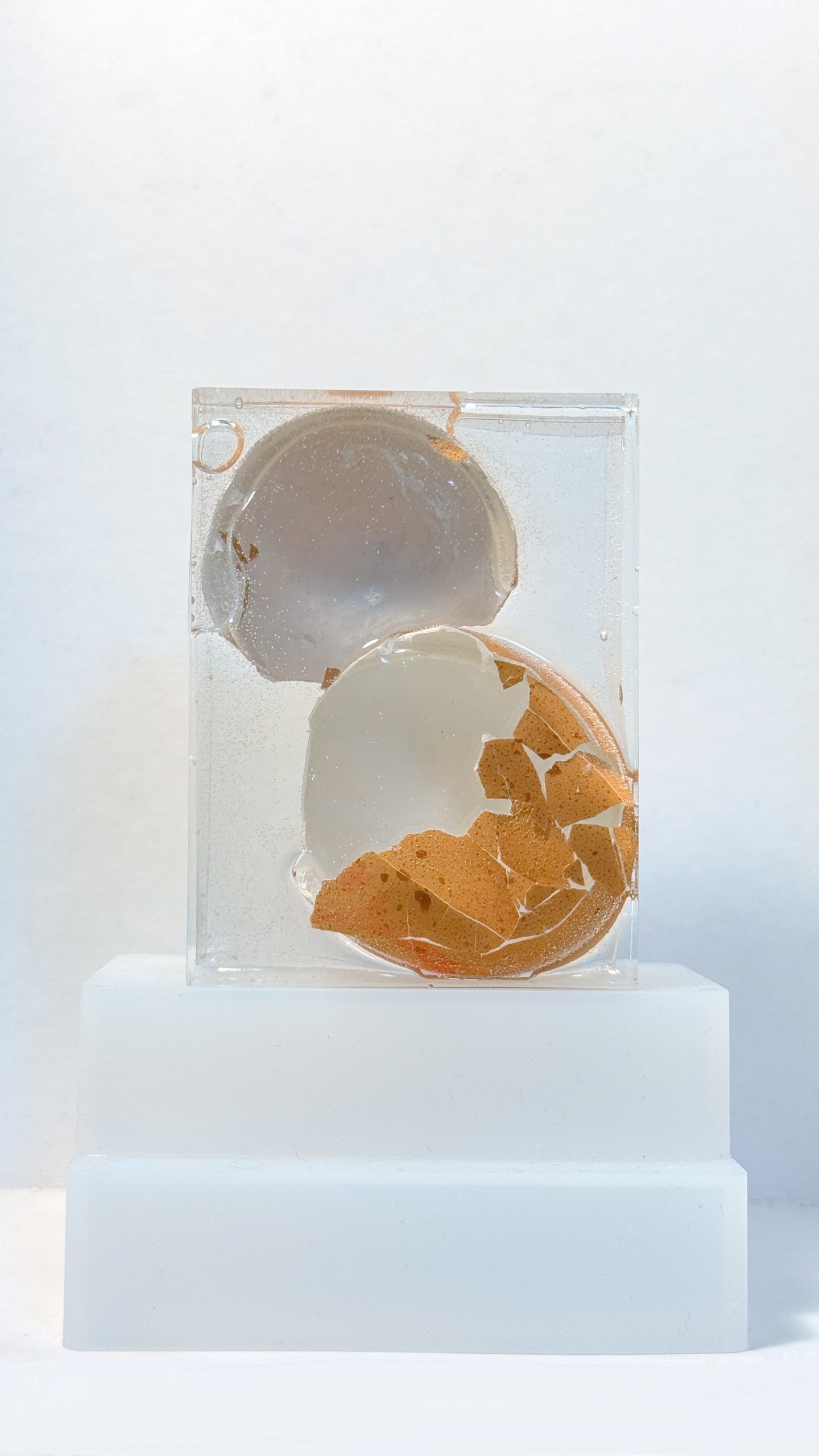 If viewed in the context of rebirth and change, perhaps my piece could be interpreted as a comment on how the human race’s attempts to change, refresh how it exists and functions as a system of differing societies, are continually broken as we fail to really learn from past experiences? Perhaps it’s a suggestion that rebirth is possible, just painful, difficult? Perhaps it suggests that the idea of Neoplatonic love is a mythical, unreal expectation (the perfect egg is broken), but in memorialising it’s cracked carcass in an amber-like coffin, there is a suggestion that the ‘imperfect’ love we experience in reality, the ‘perfect love’ we need for our growth? Perhaps it counters the unreality of present societies depictions and desires of an ideal body (for all genders), and again, the memorialisation of what we perceive as broken, imperfect, reflects on the true beauty that is inherent in every bodily form? I like to think this piece holds multiple stories, the viewer hears whichever they want.