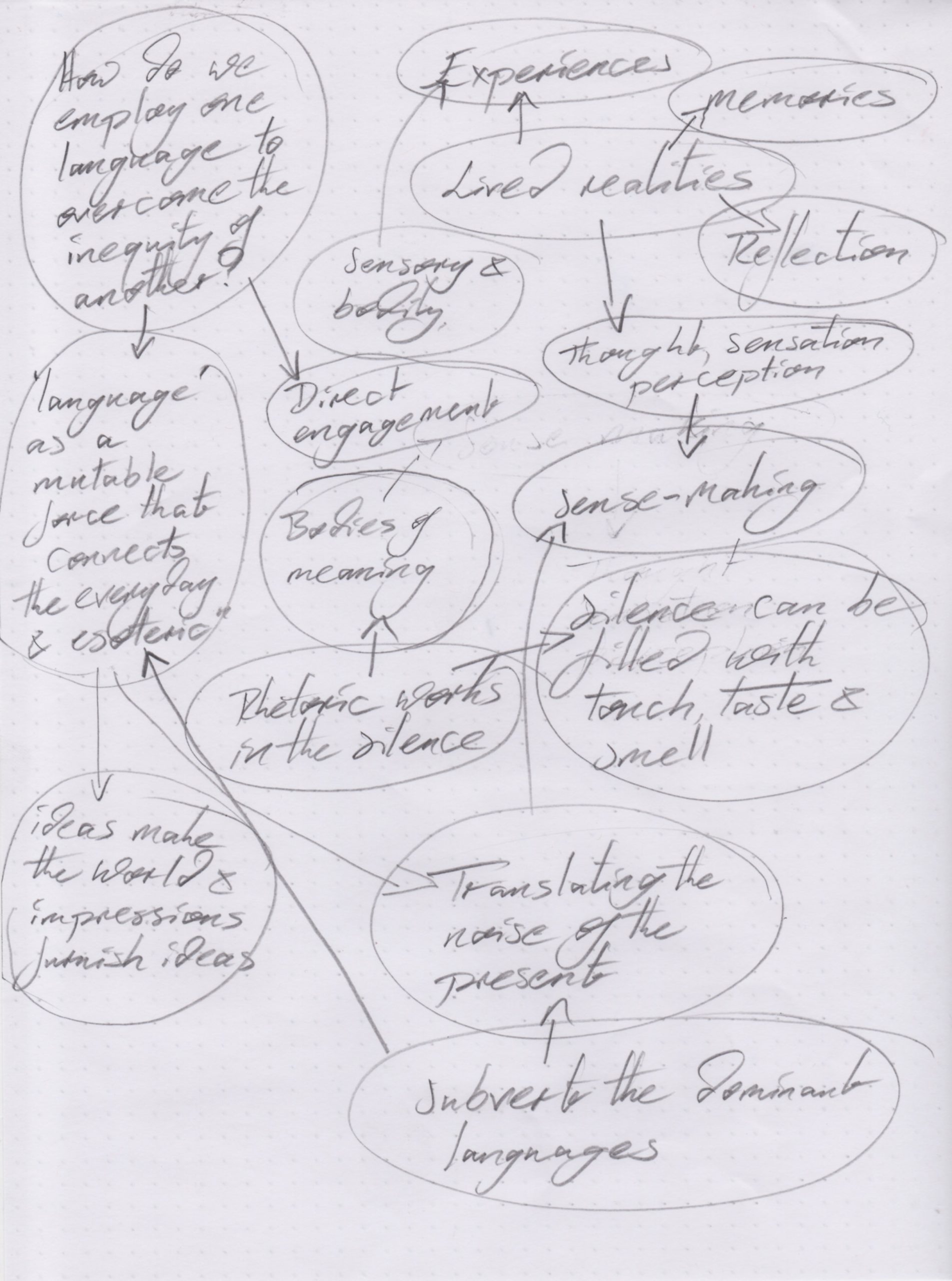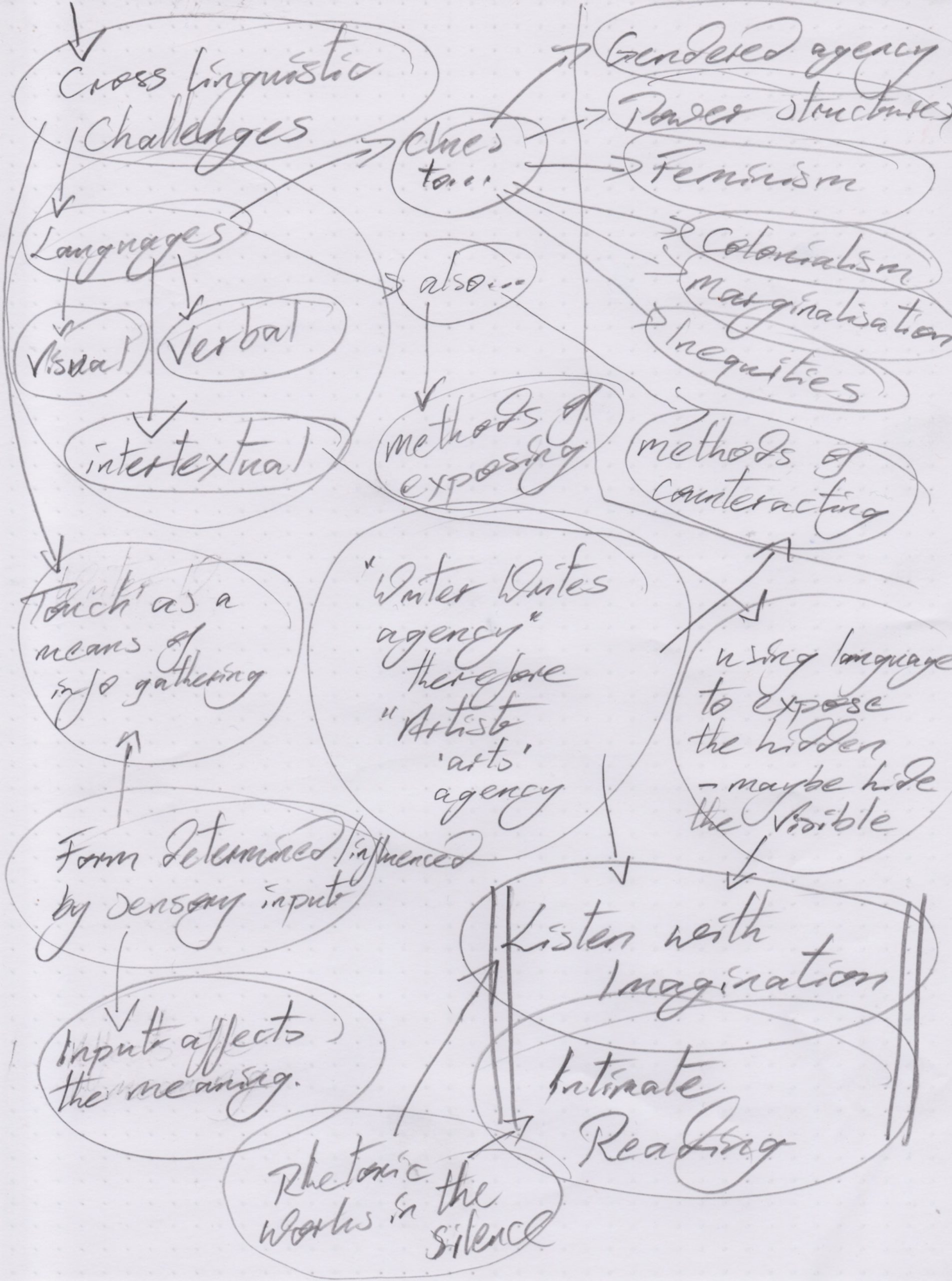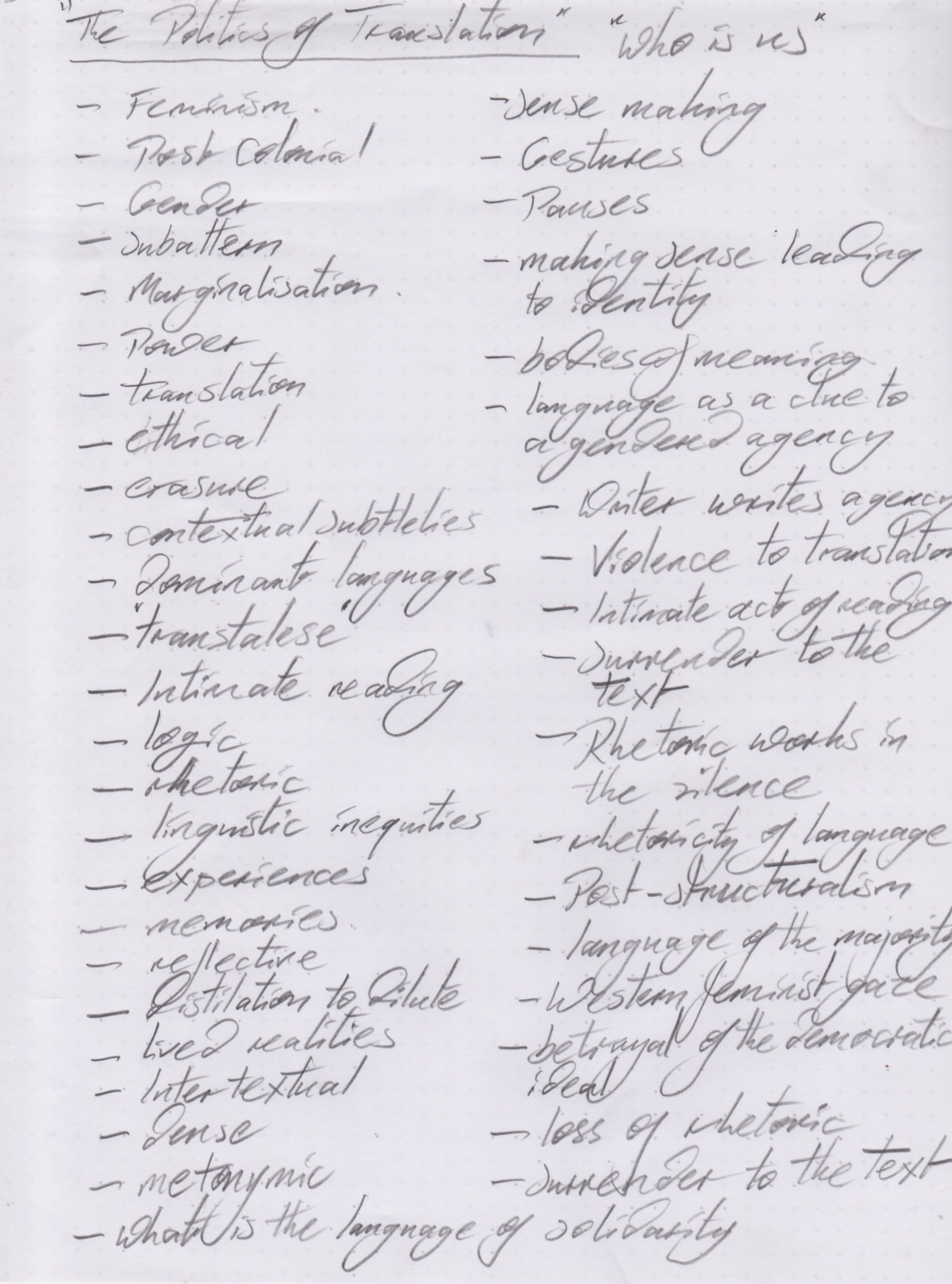 Reducing each of these essays to a ‘list of keywords’ is in itself an act of translation, but one that errs more towards what Spivak may consider a ‘performance of violence on the act of translating’. By creating these lists, we are stripping out the rhetoricity of the originals, excising the meaning that is contained within the gaps, pauses, relationships between words and the contextual subtleties of each essay. We are potentially losing the understanding that comes from reading each.