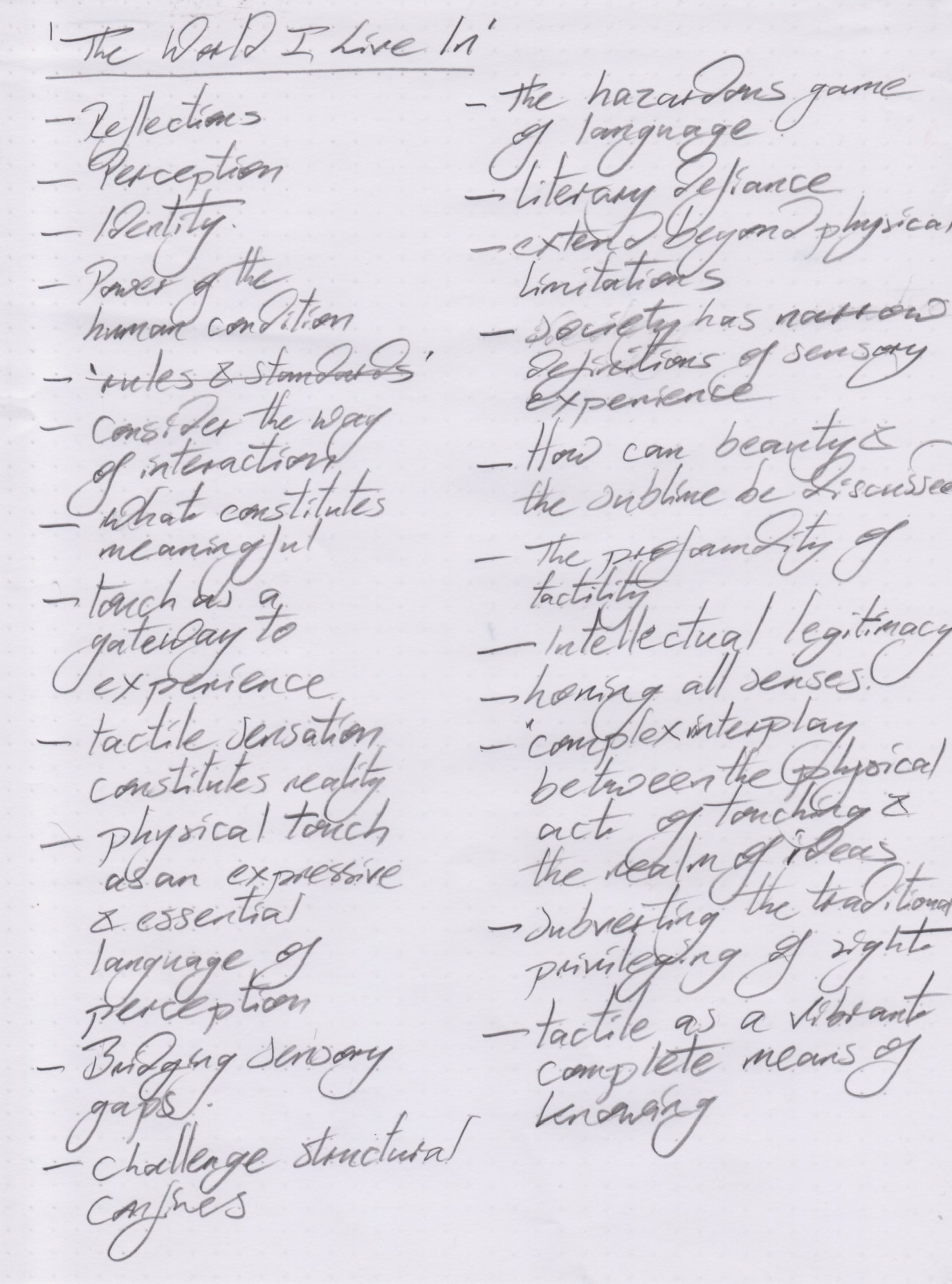 But perhaps this perspective misses some of the point of the exercise. Perhaps the reductionist approach we have been asked to take should focus on making lists that document those gaps, pauses, relationships and contextual subtleties. It is in those places that our understanding and knowledge begin to form. And then as we begin to extract those words and phrases that bear meaning for us, begin to create connections between originally disparate concepts and semantics, a new layer of knowledge begins to arrive – ‘Germinations’ as Akomfrah described. This is where we begin to consider new ‘zones’, ‘borders’, ‘limits’ and ‘demands’. Essentially we are exploring another aspect of Akomfrah’s ‘dialectical philosophy of montage, but primarily through language and not image, in this case.
