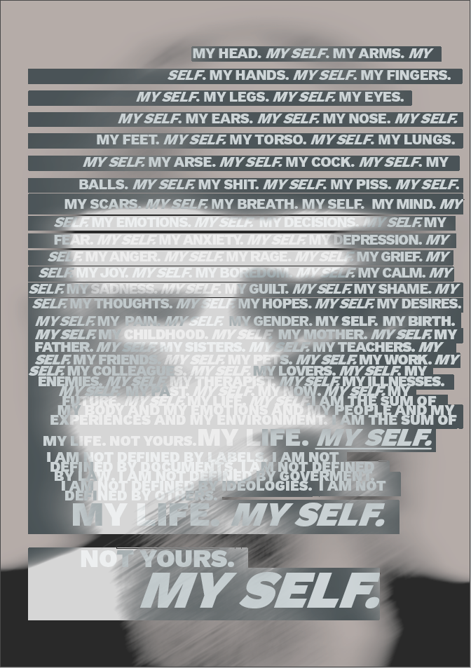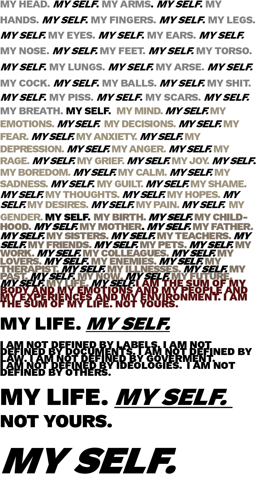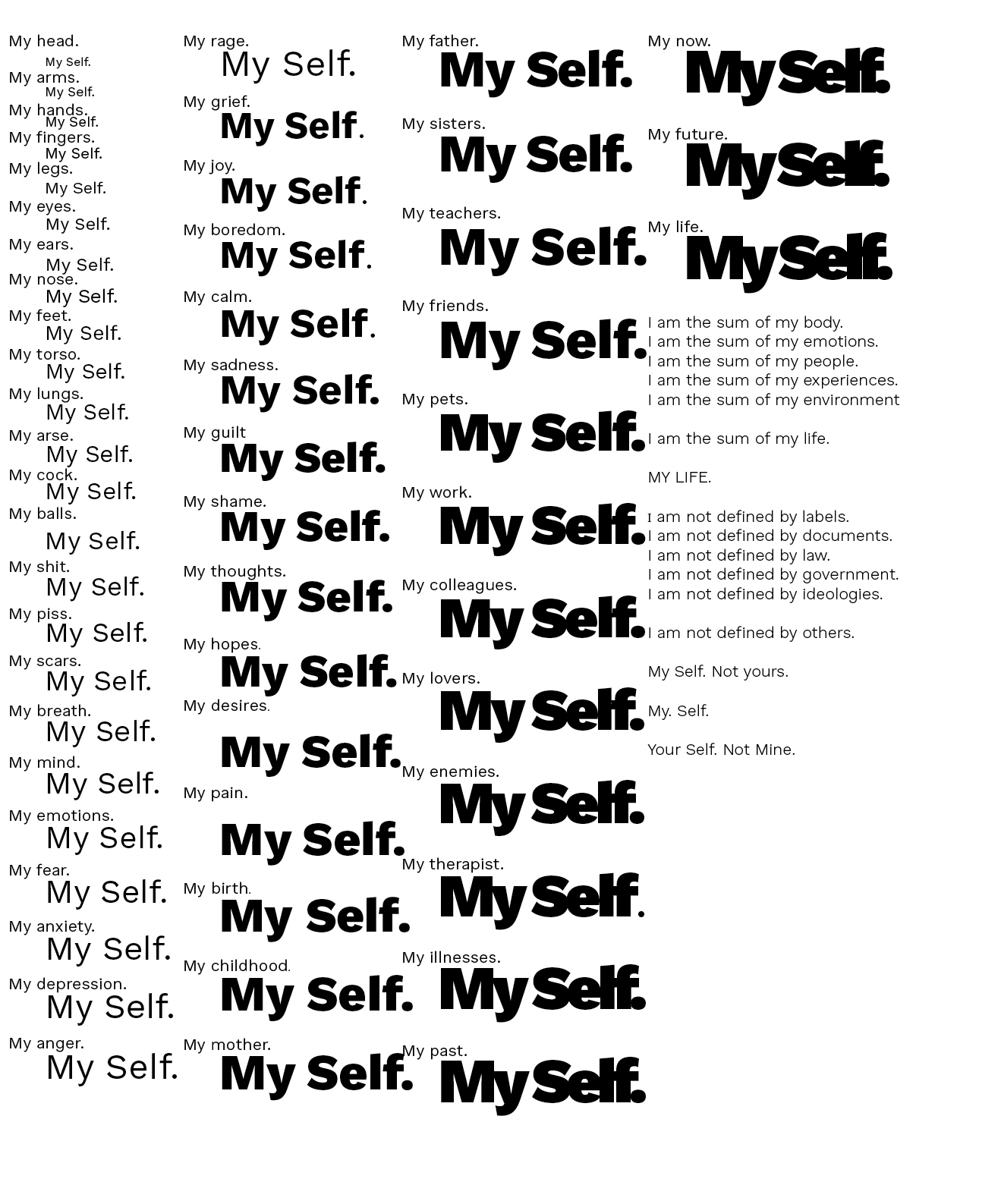 My first thought was the piece as a purely typographically work – probably the influence of my day job at work. So, I reproduced the Word piece in InDesign, beginning with matching the 3 columns. But merely reproducing the Word doc meant the piece occupied a passive space that lacked a sense of my anger. My thought then was to sequentially scale aspects of the text, My Self, to angrily reinforce the belonging of the ‘components’ to me. This approach did add a new layer to the visual rhythm, but it was obviously for me, not the correct aesthetic to carry the piece: it resembled too much, an old Letraset catalogue.