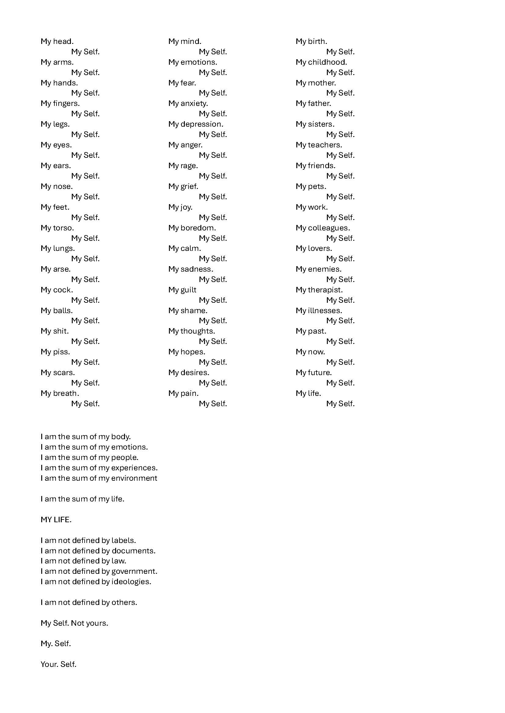 I begun segmenting and ordering this list into physical, internal and external elements. The thinking began with pencil and paper, then migrated into MS Word, where that segmenting manifested as 3 columns, meant to be read from top-to-bottom, then left to right. And seeing the words typed out, initialised a need for a declarative statement at the end, a rallying call, one that unambiguously stated my ownership of my self and pushed against attempts at structural control. Those words flowed serendipitously with little effort.