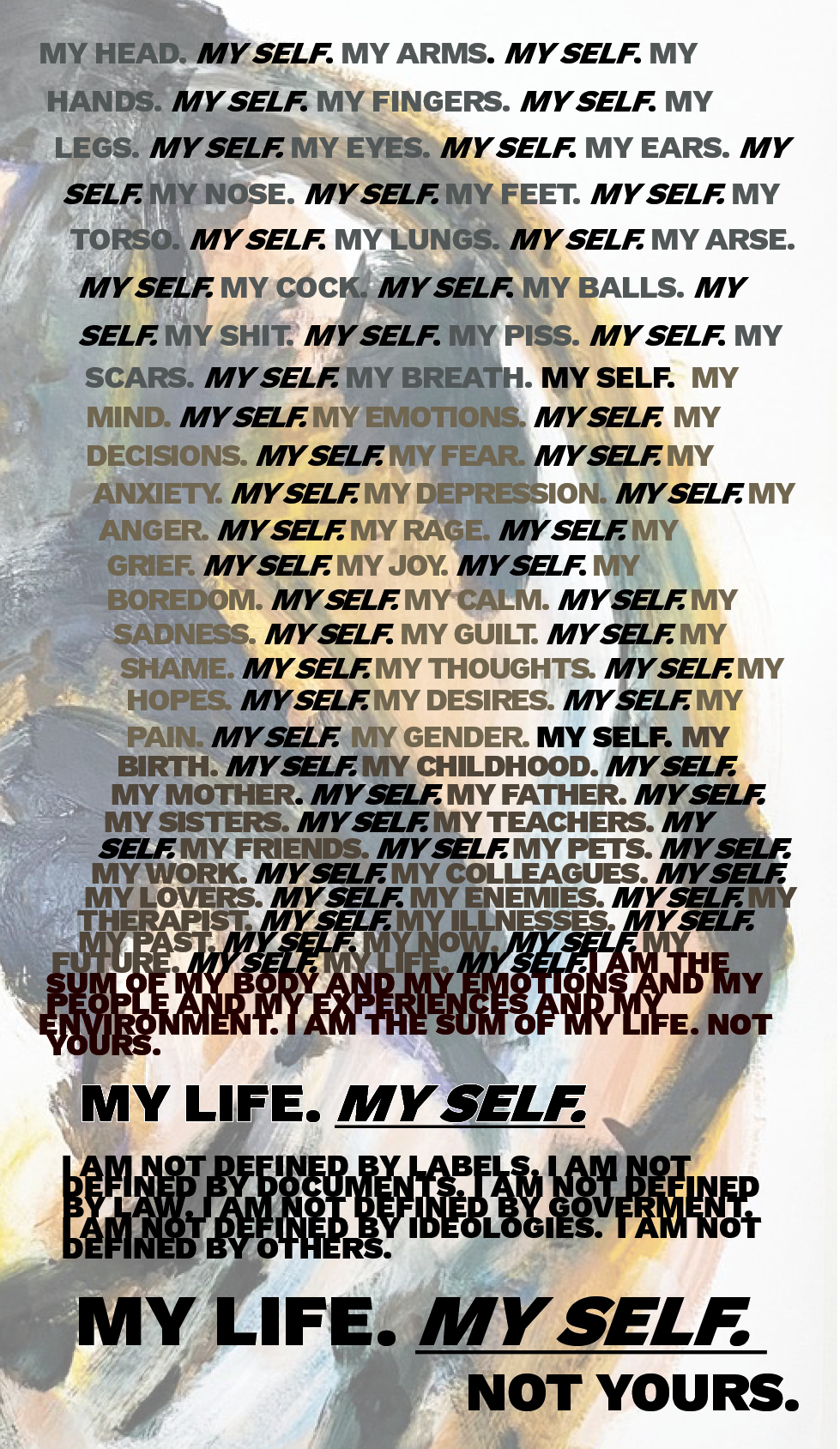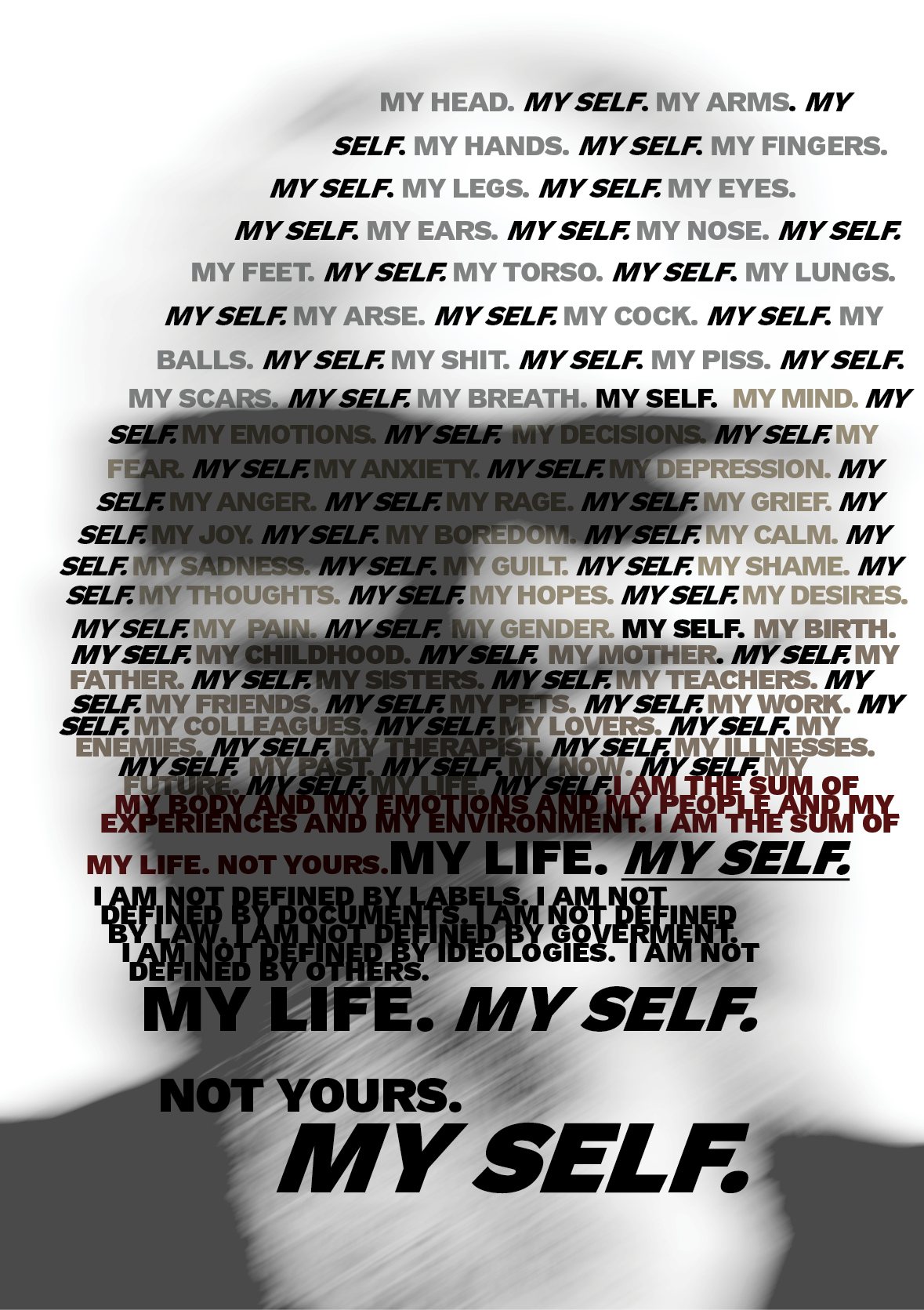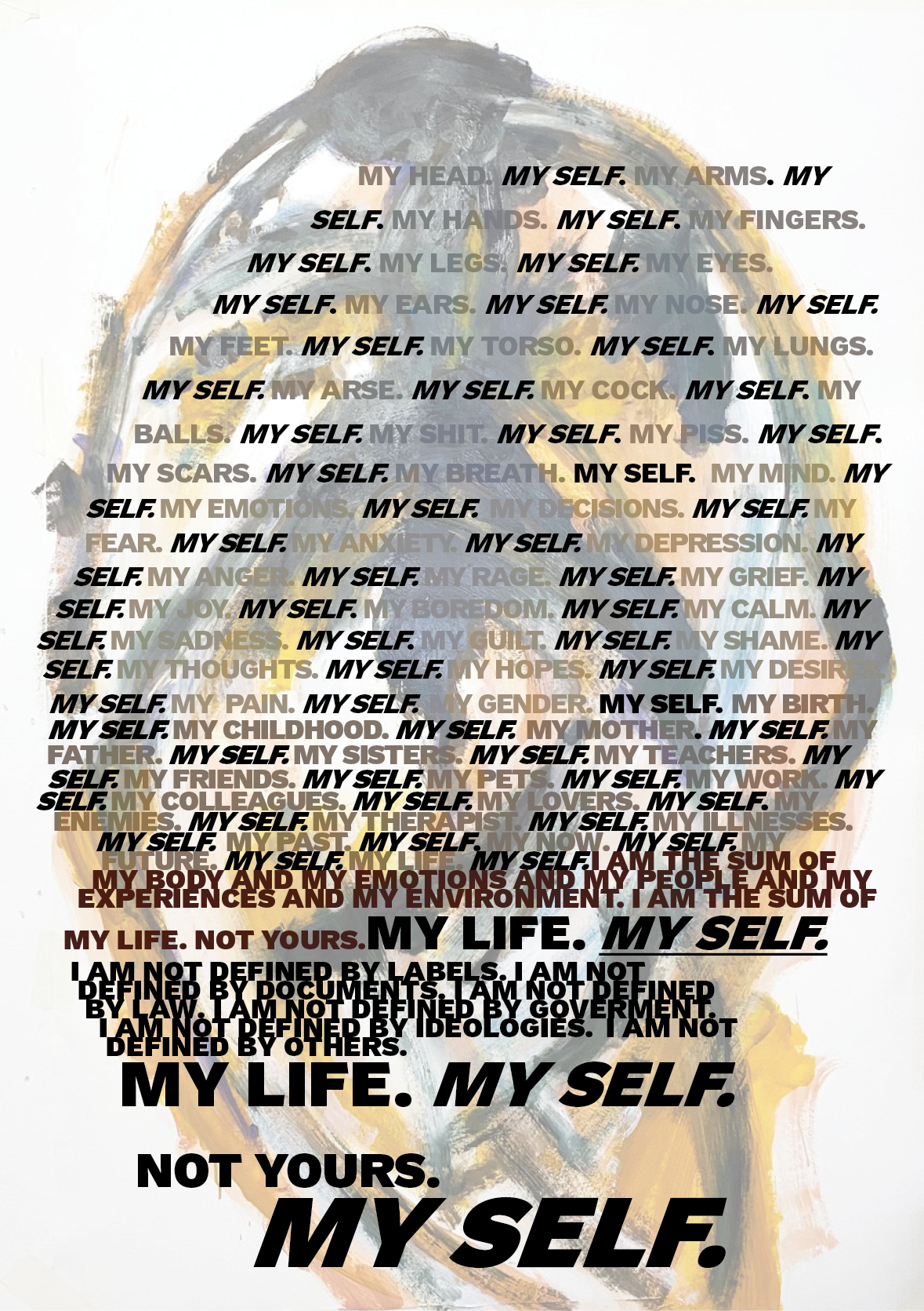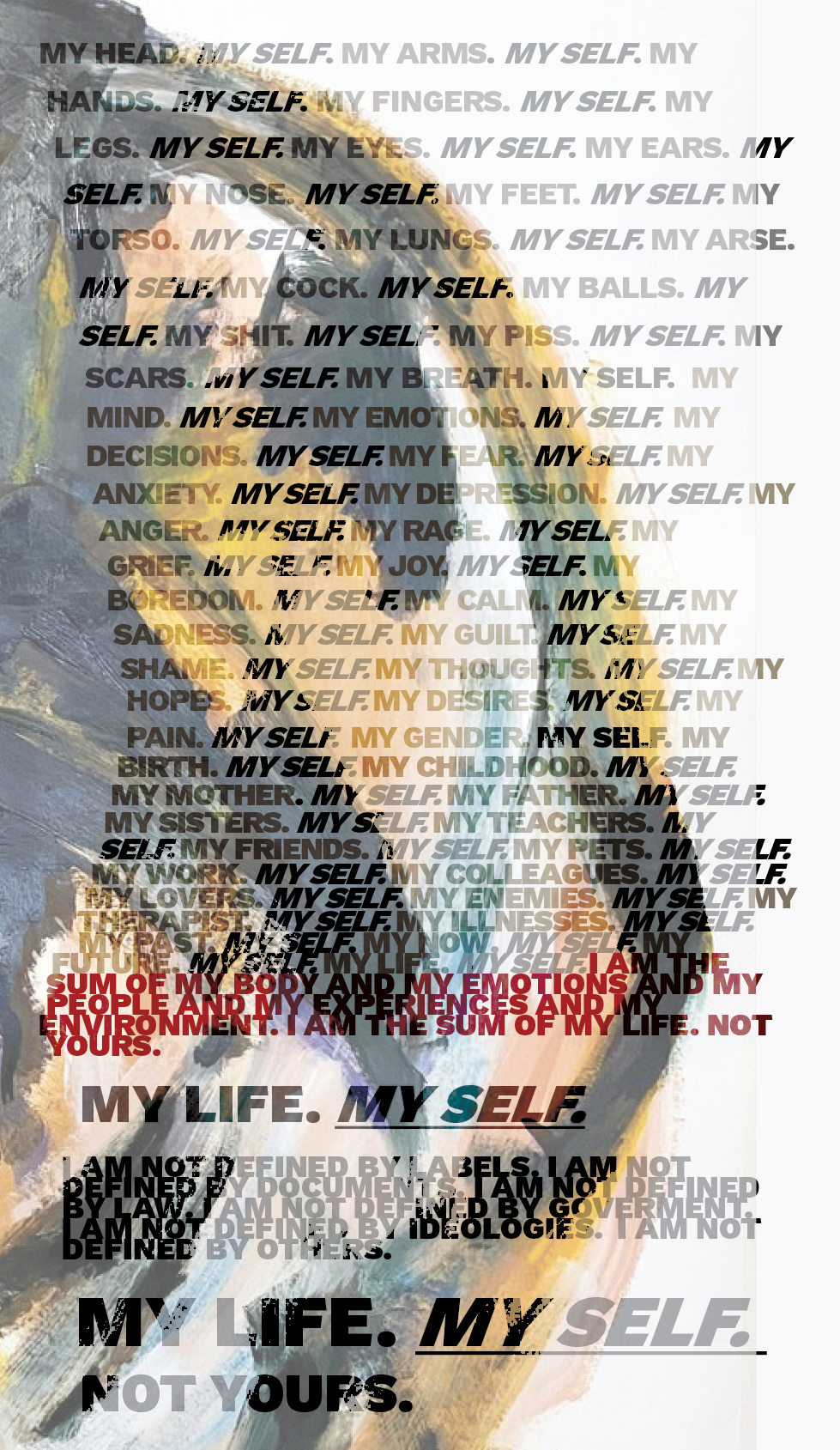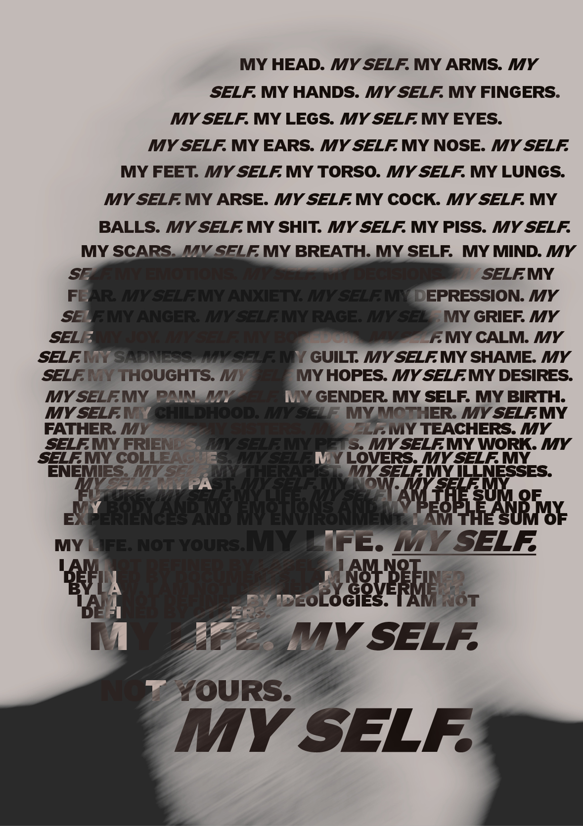 As a white, straight man, the high court’s specific judgment doesn’t affect me. The nature of the decision potentially does though; it could be seen that the law and the government has tacitly given itself the right to exert, at some point, control over some aspect of my identity. From a personal standpoint, this piece speaks against that future possibility. I want it to act as a strong counter to remind our embedded patriarchal systems that my identity is mine, I determine who I am, the life-experiences I have had, the conditions of my upbringing – and so much more – are what give me my identity.
