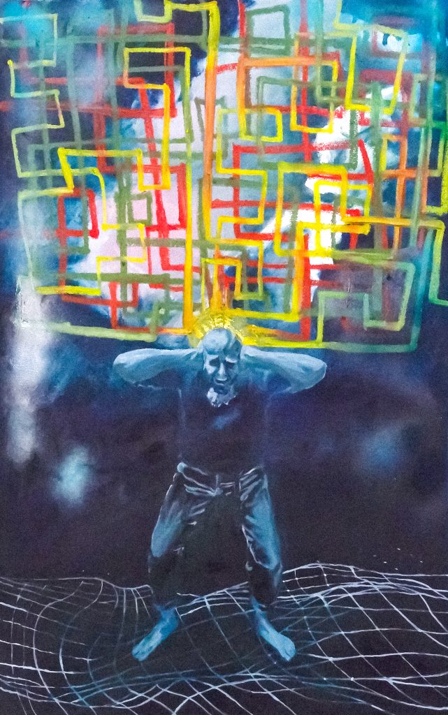 This painting is a continuation of the research I had carried out in Project 5. With tutor encouragement, I approached this at a much larger scale and with materials I had never before used (oil stick). Editorial decisions were made before beginning – which elements to include, which to discard. The ‘code’ background and the oppressive Zoom faces were discounted as they could potentially visually overload the painting. Again, a projector was used to transcribe the composition elements in stages onto the larger surface, with the background laid first. The ‘thinking-lines’ were last to be added and there was some trepidation about committing those to the composition, especially as I was very happy with the execution of the figure.