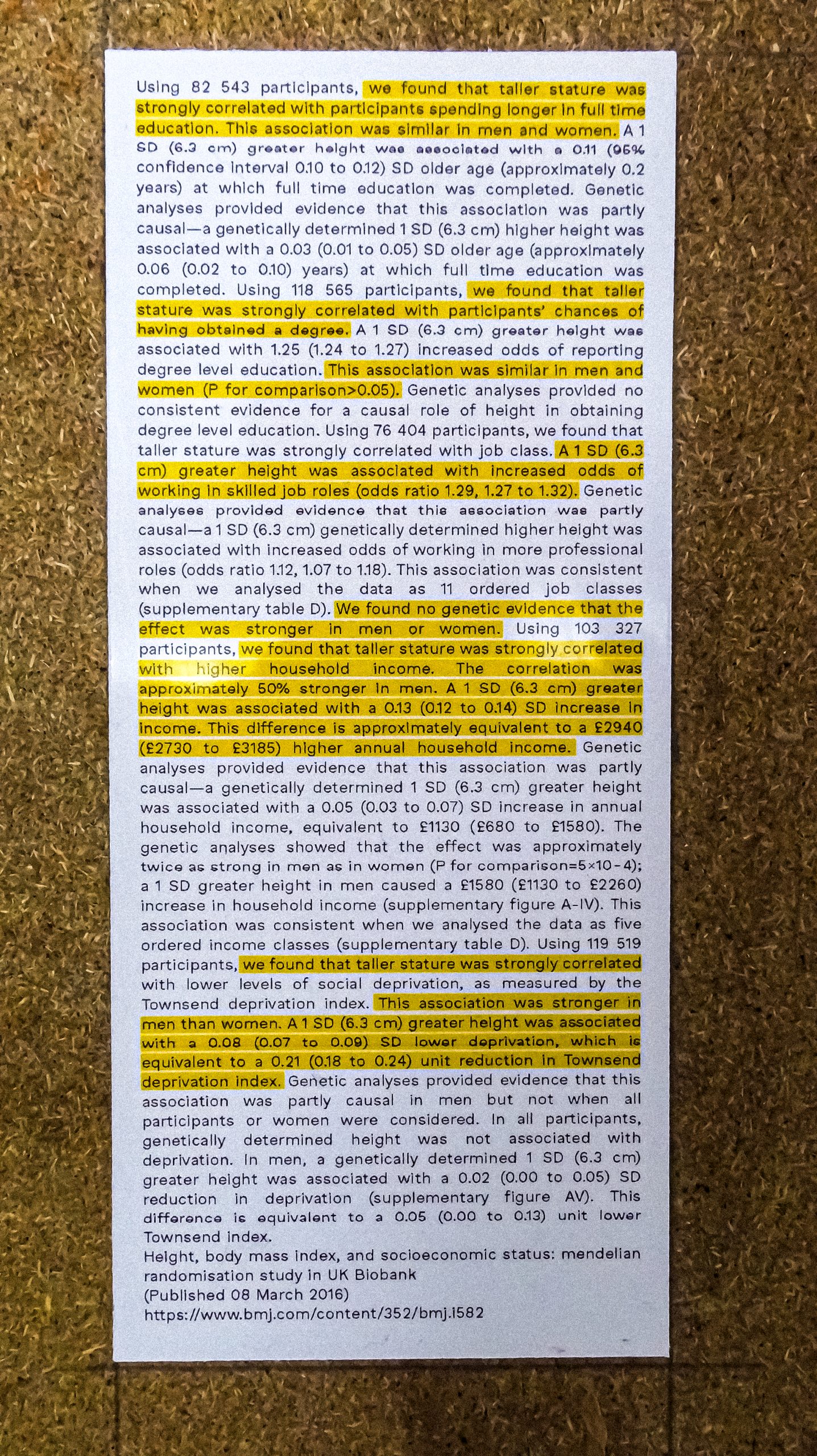 The data in the printout evidences how people of minorities and colour are implicitly discriminated against by systems that are patriarchal and white. The plaster in the centre references an obvious implied discriminations – the colour of medical plasters being almost predominately tailored for white skin. It also references how white people apply a ‘sticking plaster’ to the problem by denying existence of their own privilege or that by just being white they can be contributing to the continuation of structural oppression and discrimination.