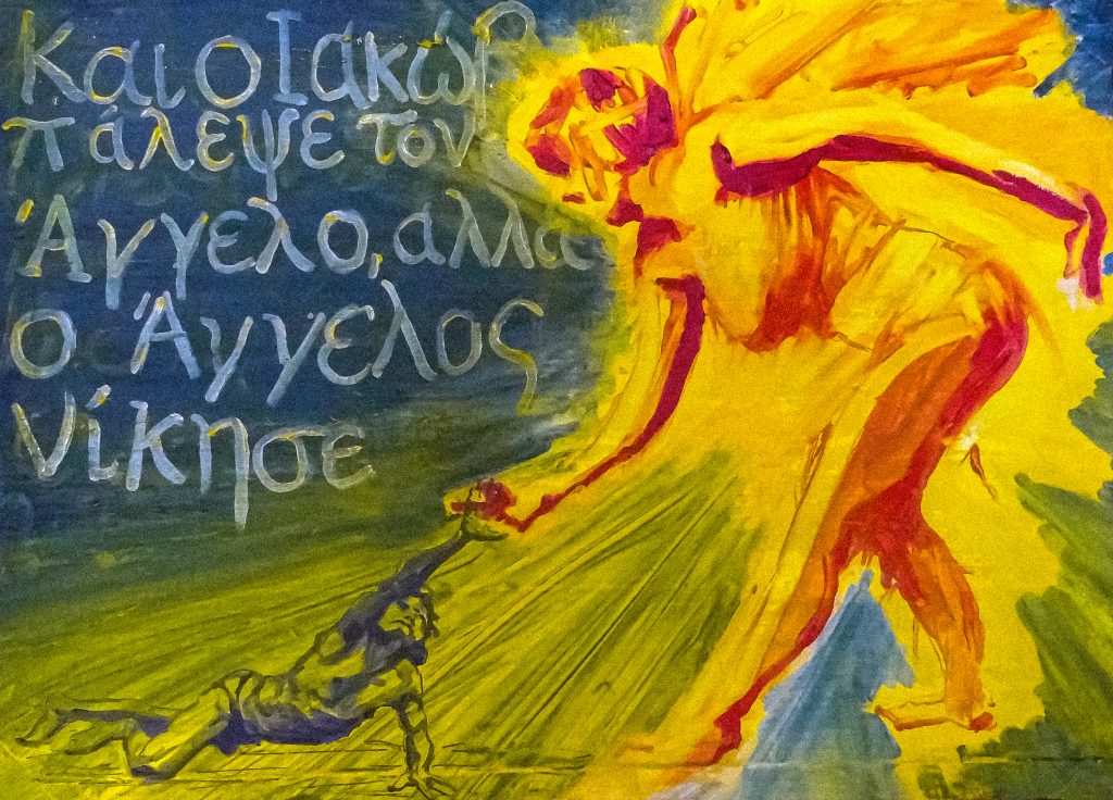 The decision to transpose the text “And Jacob wrestled the Angel but the Angel overcame” in Greek was a decision made for aesthetic and historical narrative reasons. I had tried several versions in English but the modernity of the language and character set didn’t fit with the historical nature of the reference. I thought of Rembrandt’s painting ‘Belshazzar’s Feast’ and how the artist used Hebrew text in the upper right quadrant of the painting and not his native Dutch. This prompted the decision to use Greek (translation from Google Translate, so unsure of accuracy) as this was the language of the first Bible, the Septuagint, and the source text for most modern versions. There is also a decorative quality to it that references the use of copy in the work of Shirin Neshat and Parviz Tanavoli.